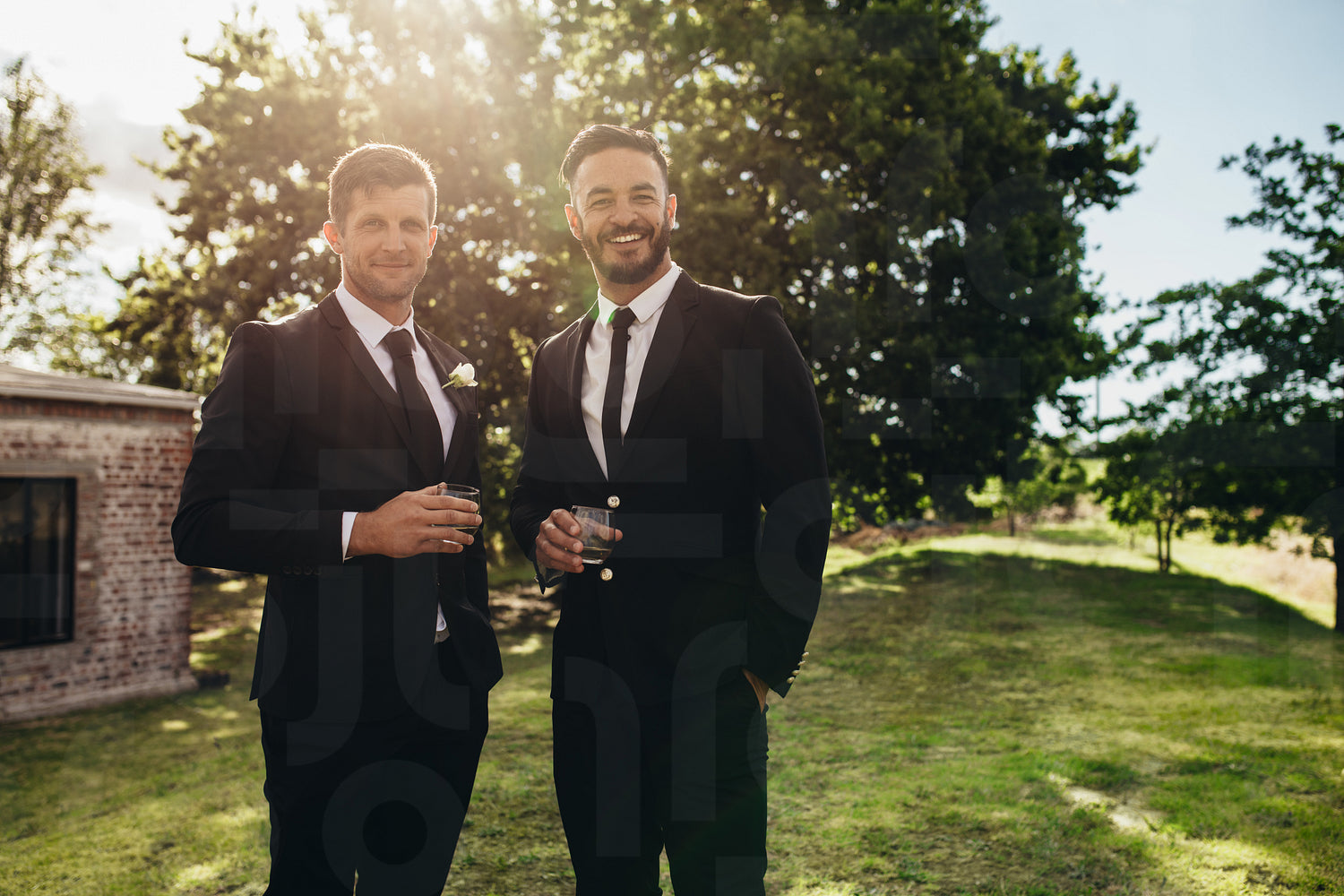 Portrait of handsome young groom standing with his friend having drinks at wedding party. Bridegroom and best men after wedding ceremony having drinks at park.