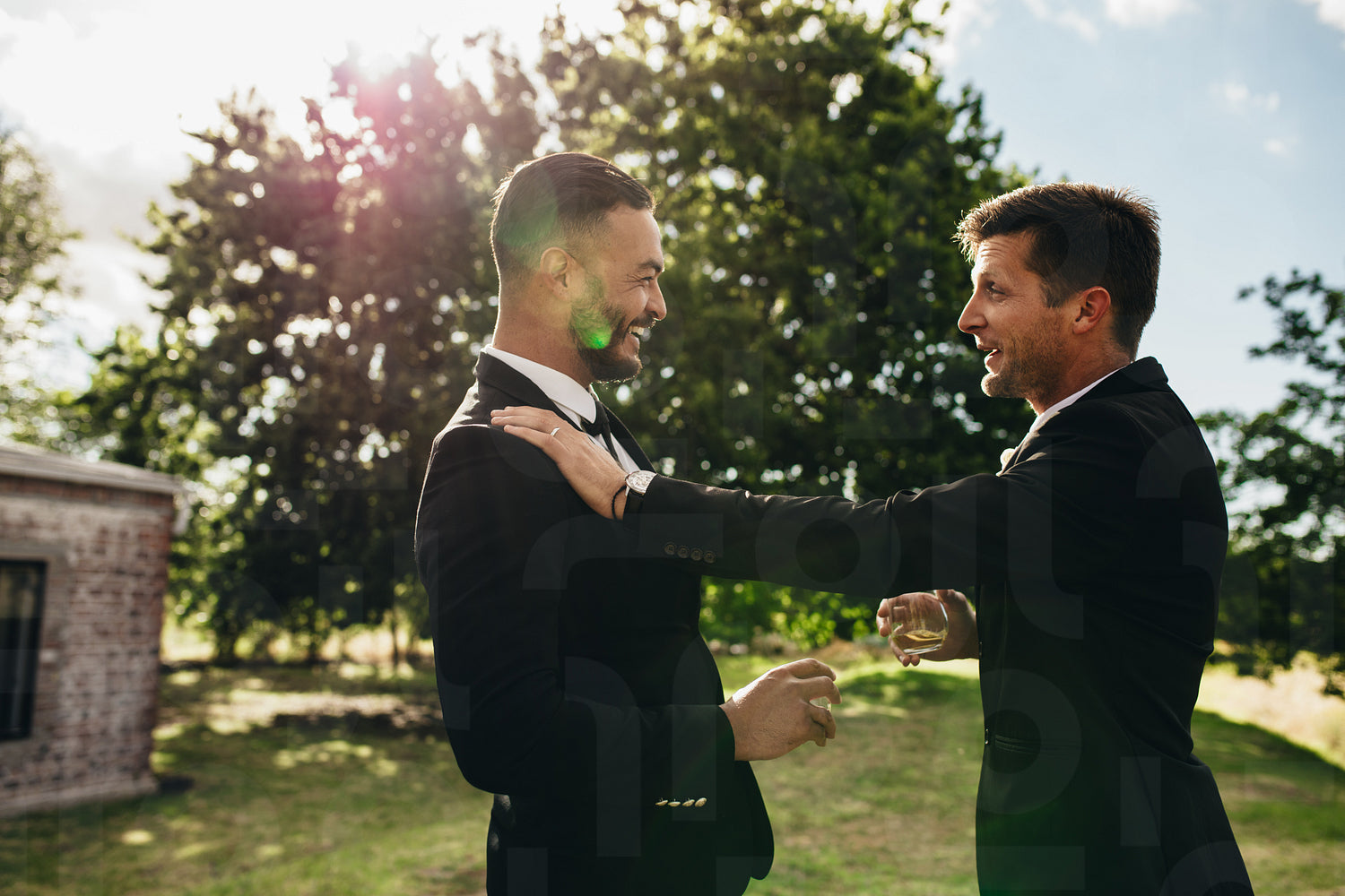 Groom talking with his best man with drinks in hand during wedding party. Groom and groomsmen partying after wedding at park.
