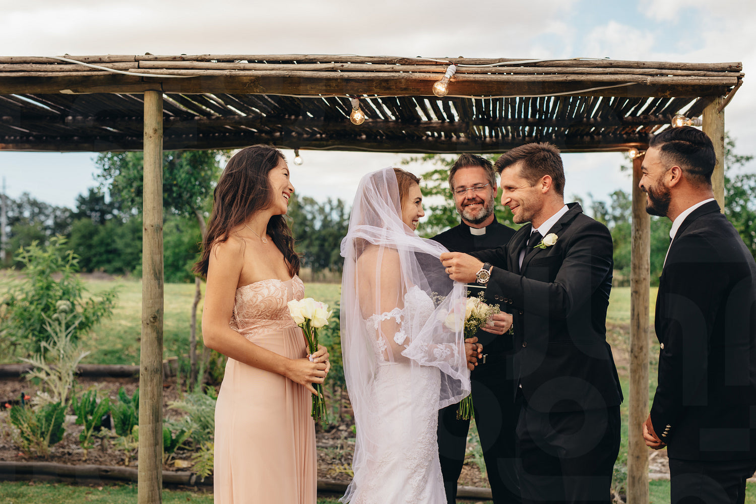 Newlywed couple about to kiss after the ceremony