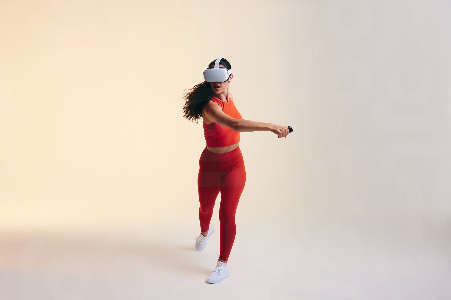 Young woman working out using 3D technology. Athletic young woman exploring a virtual reality fitness game. Sporty young woman wearing virtual reality goggles in a studio.