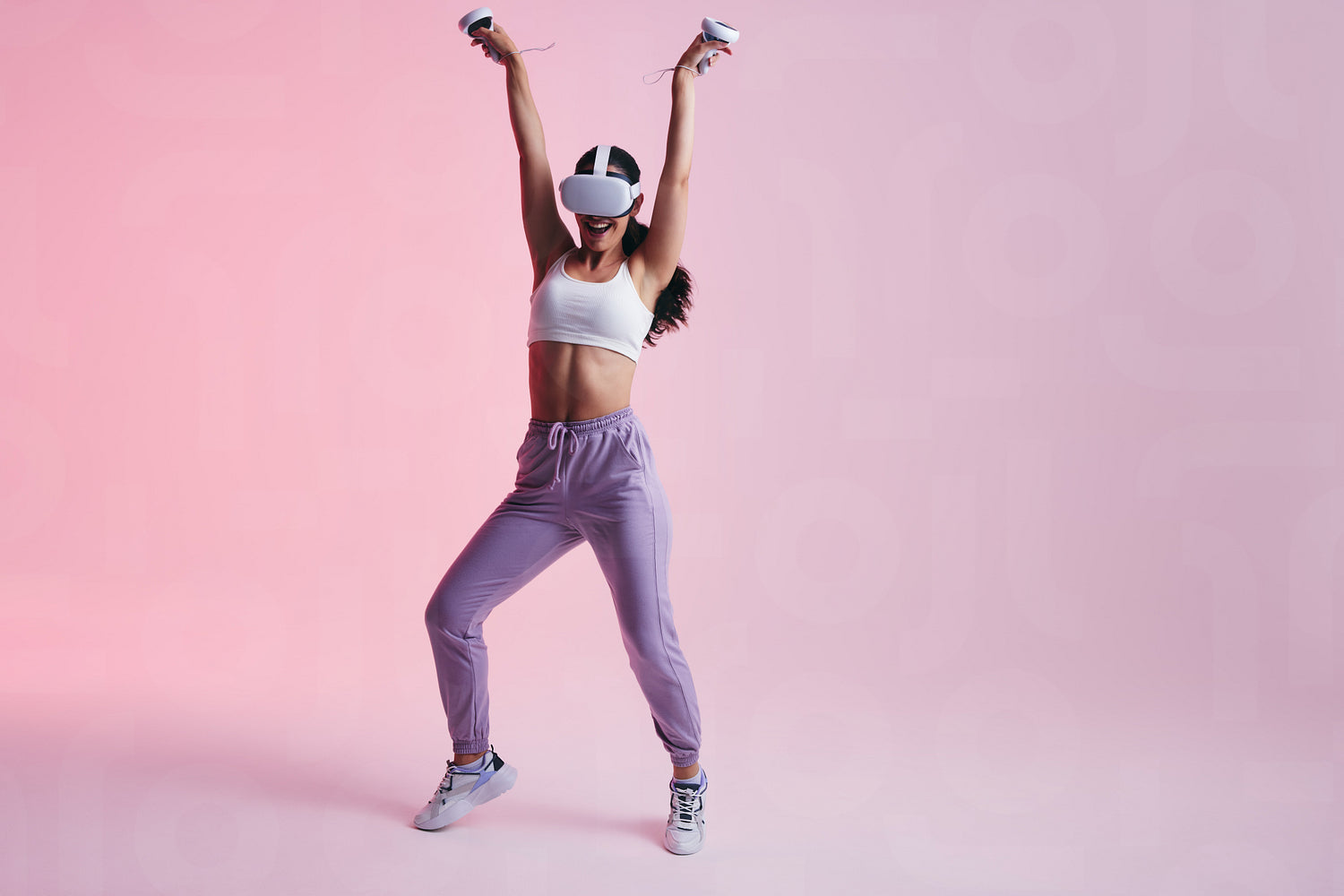 Fun in the metaverse. Happy young woman dancing cheerfully while wearing a virtual reality headset. Active young woman enjoying herself while exploring VR technology.