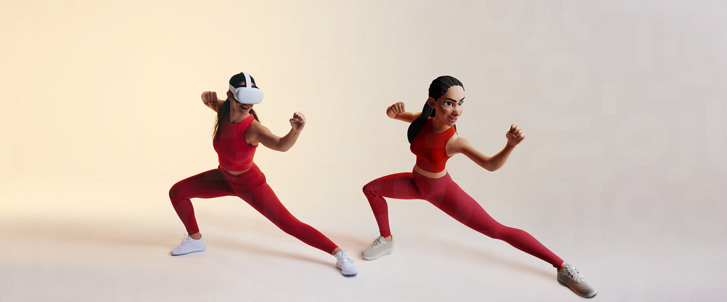 Happy young woman playing a fighting game in the metaverse. Young woman playing virtual reality video games as a 3D avatar. Cheerful young woman enjoying a 3D experience using virtual reality goggles.