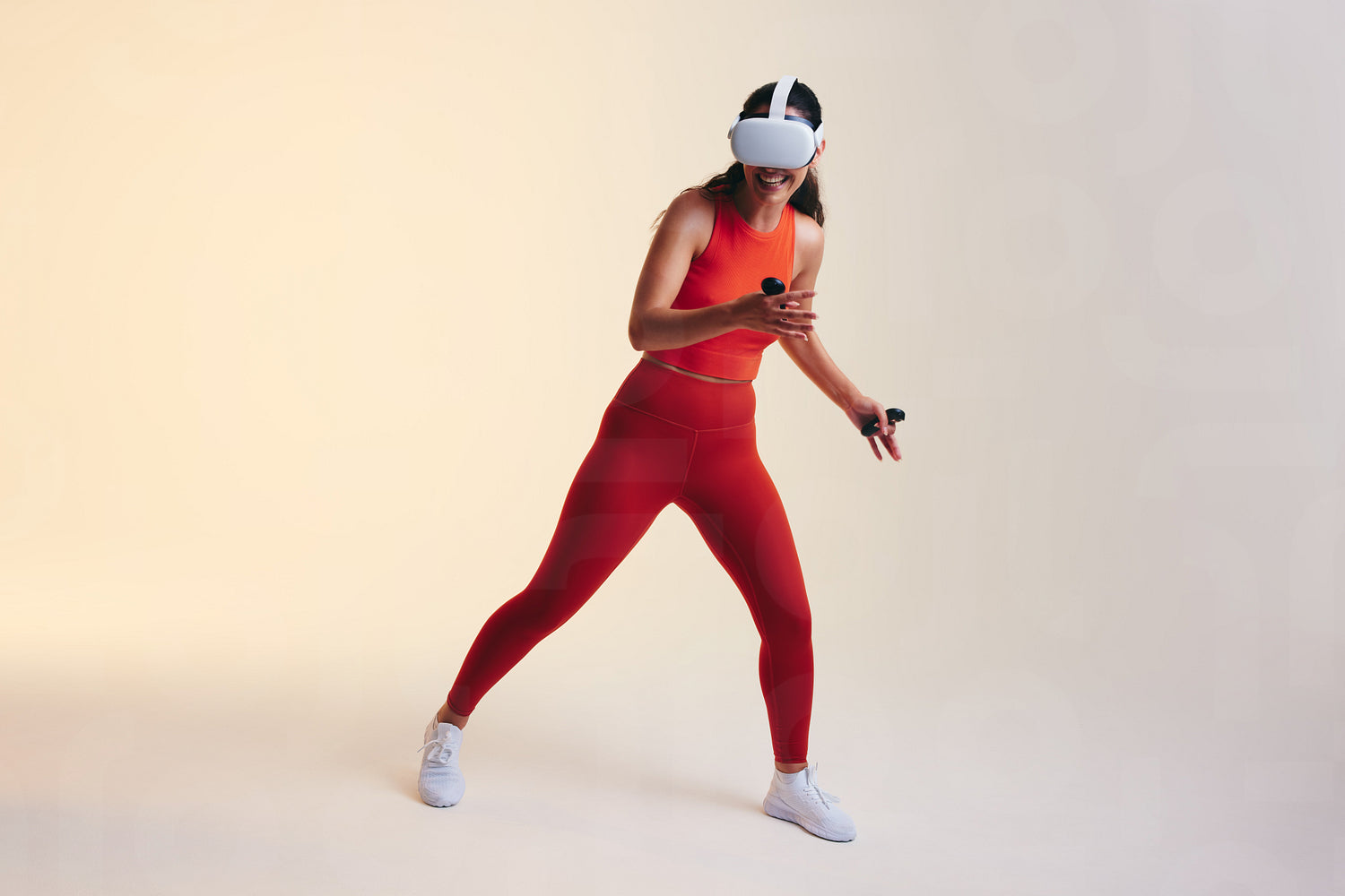 Young woman having fun with 3D technology. Happy young woman smiling cheerfully while exploring a virtual reality game. Female gamer wearing a virtual reality headset in a studio.
