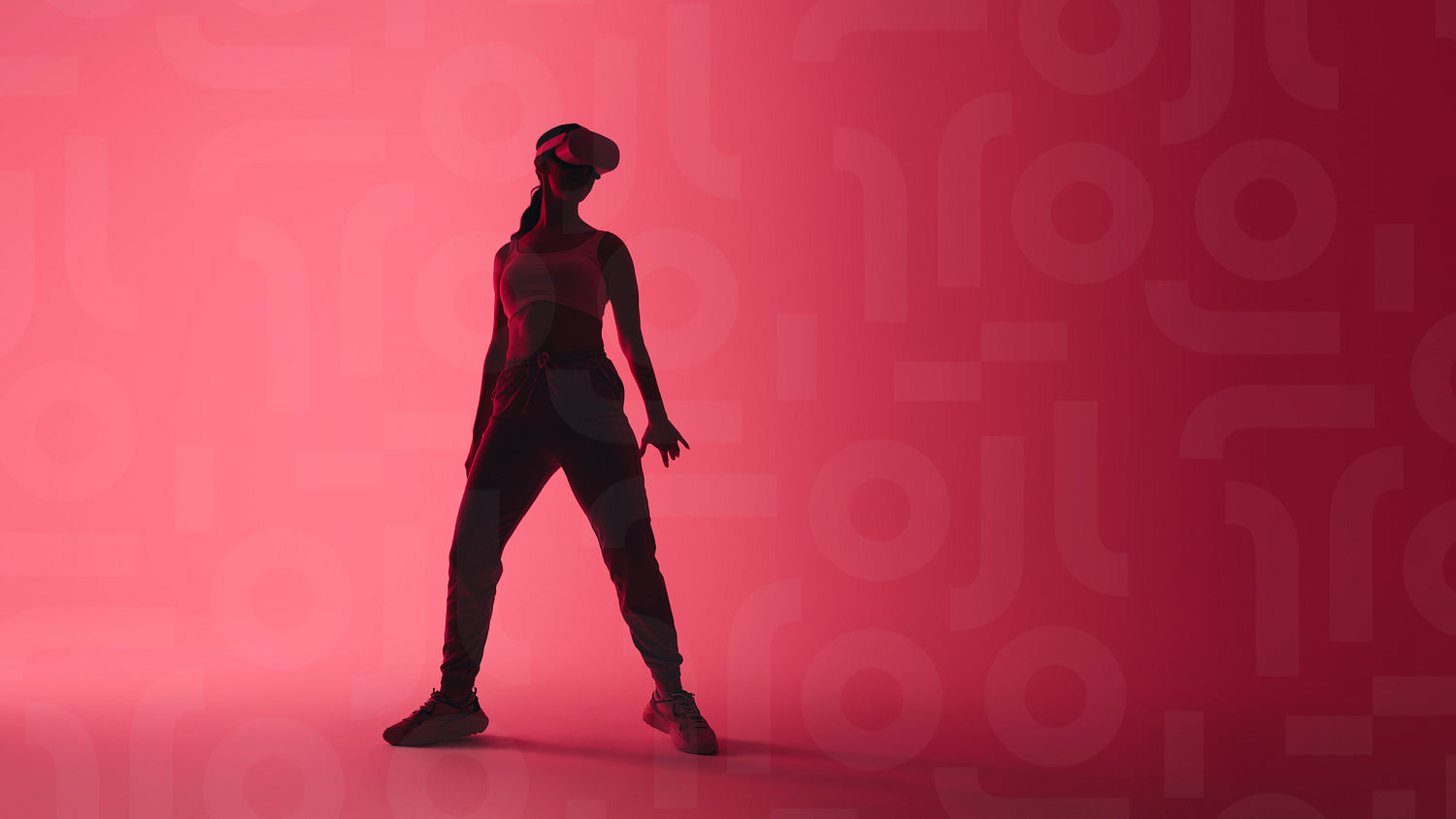 Sporty young woman wearing virtual reality goggles in neon light
