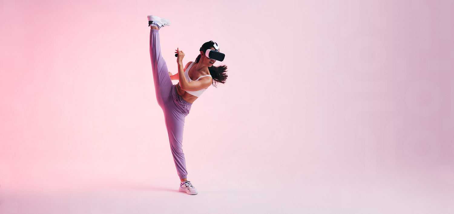 Athletic young woman working out while wearing a virtual reality headset. Sporty young woman stretching her legs during a virtual training session. Woman exercising against a studio background.