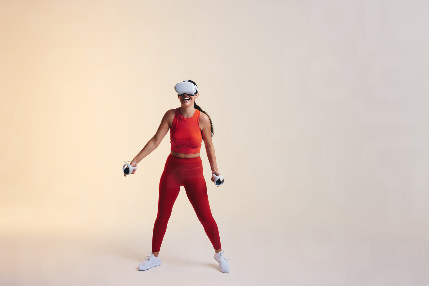 Woman enjoying an immersive virtual reality experience. Female gamer smiling cheerfully while exploring 3D technology. Happy young woman wearing a virtual reality headset in a studio.