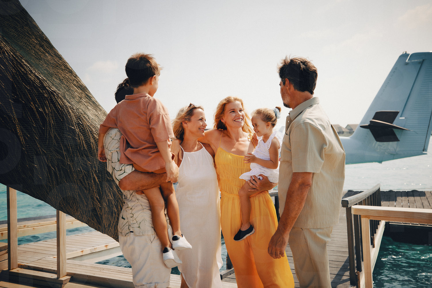 Happy family and friends arriving on holiday via airplane, smiling and excited