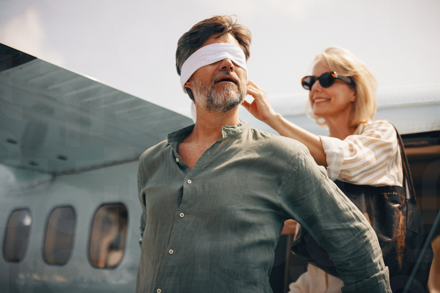 Woman surprises her partner with a blindfolded arrival at a scenic coastal retreat. Captures luxury, excitement, and the thrill of new travel experiences.