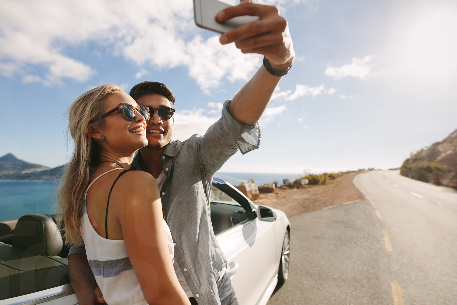 Attractive man and woman wearing sunglasses taking selfie photo together while standing by car on highway.