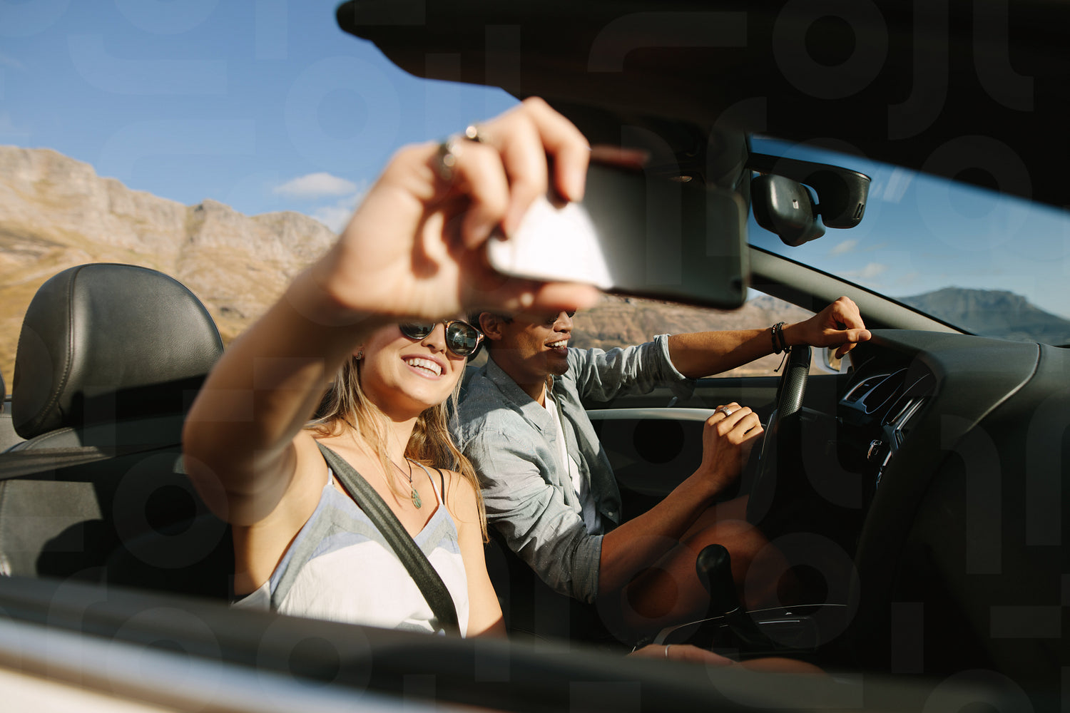Couple on road trip in convertible car taking selfie. Woman talking selfie on long drive with her man driving the car.