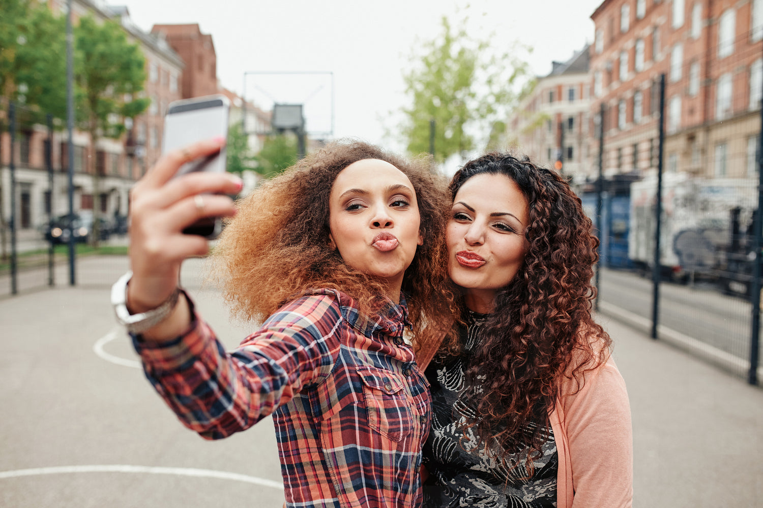 Happy young girls pout and pose for a selfie. Young girl friends taking a self portrait using mobile phone, outdoors on city street.