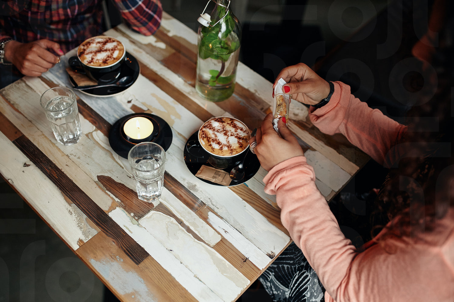 Directly above view of coffee on cafe table. Two women sitting at restaurant with cup of coffee.