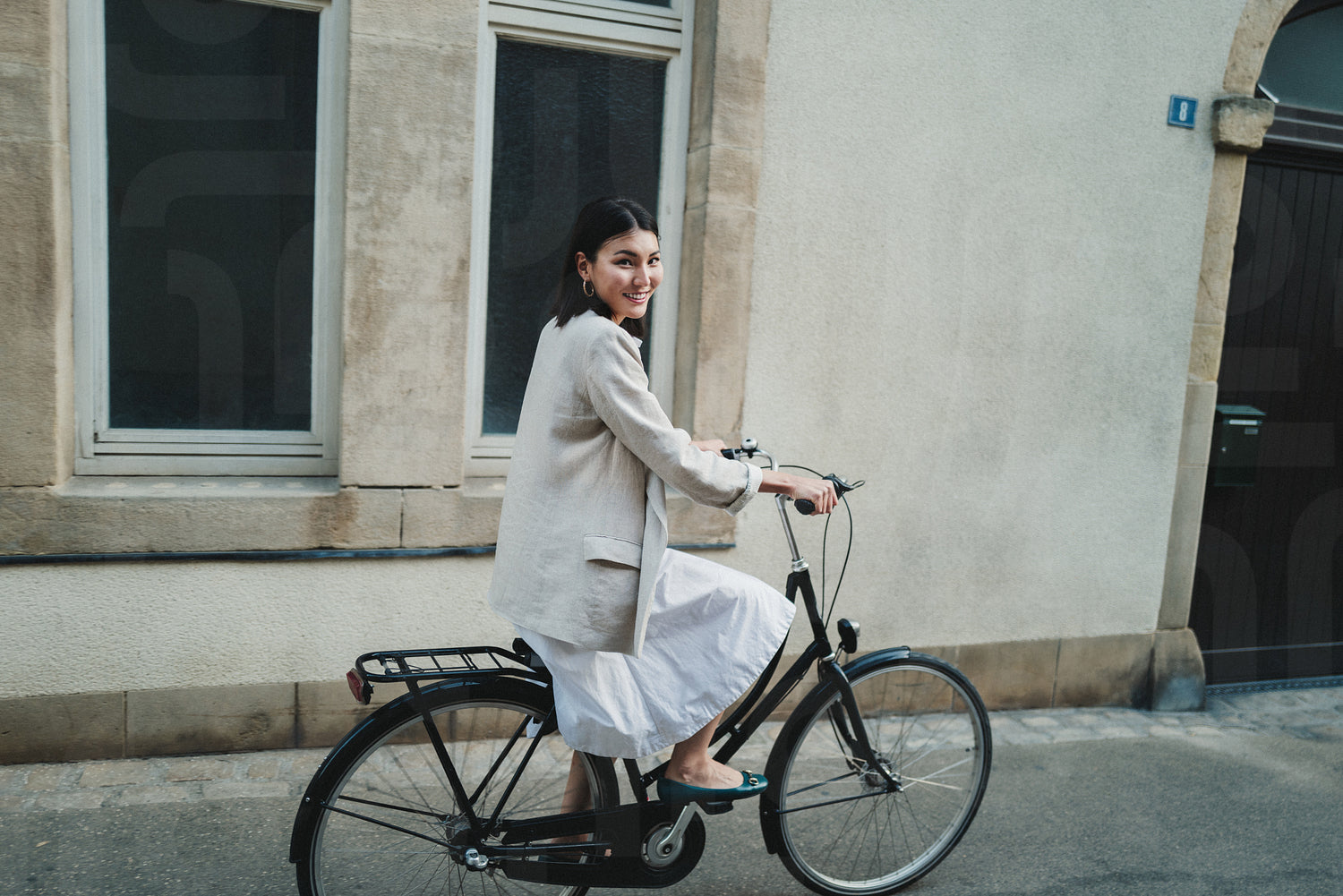 Asian woman smiling at the camera while riding a bicycle in the city. Woman touring around with a bike during a holiday. This photo has intentional use of 35mm film grain.