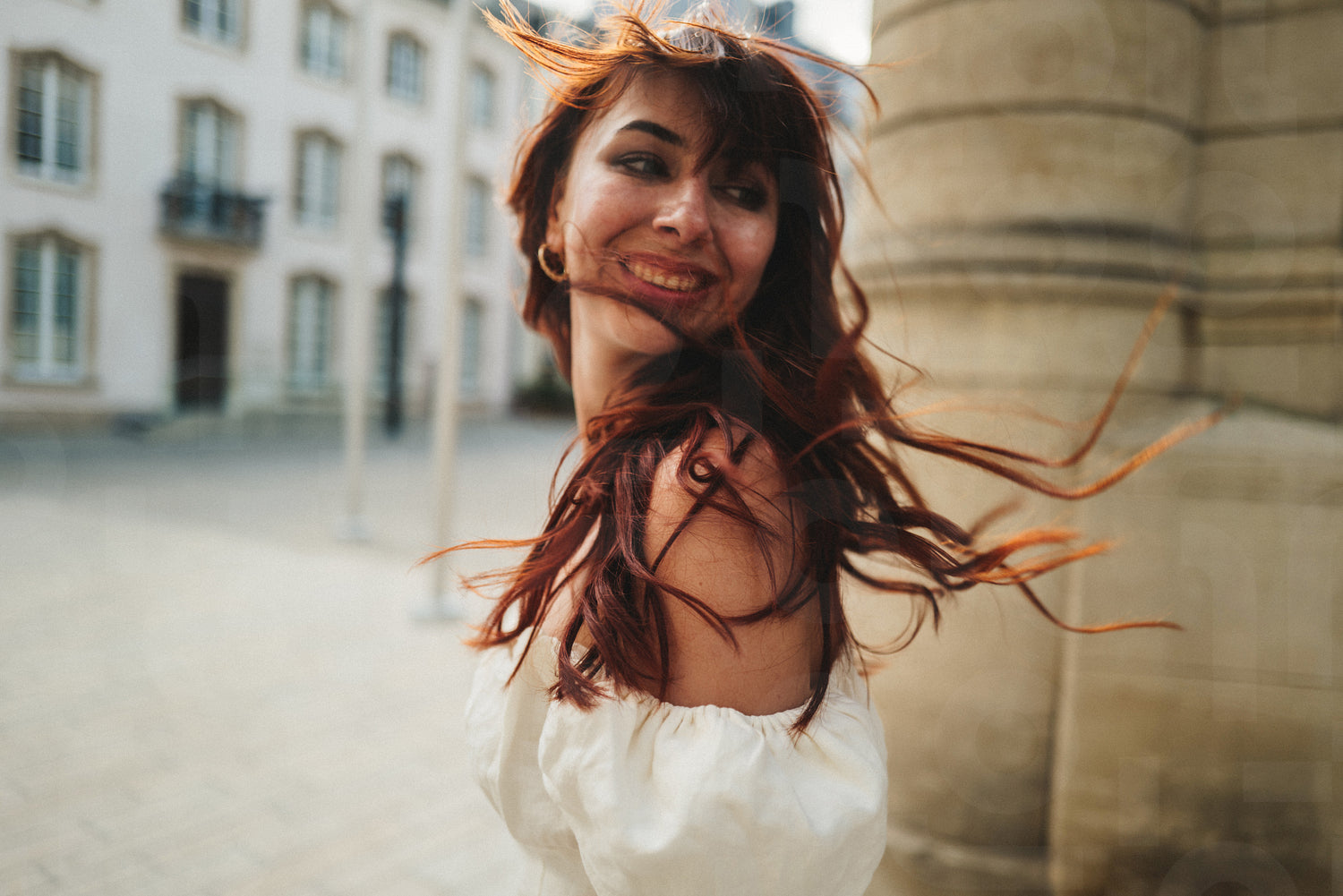 Woman with ginger hair looking over her shoulder while walking in a street. Woman in casual clothing enjoying herself in the city. This photo has intentional use of 35mm film grain.