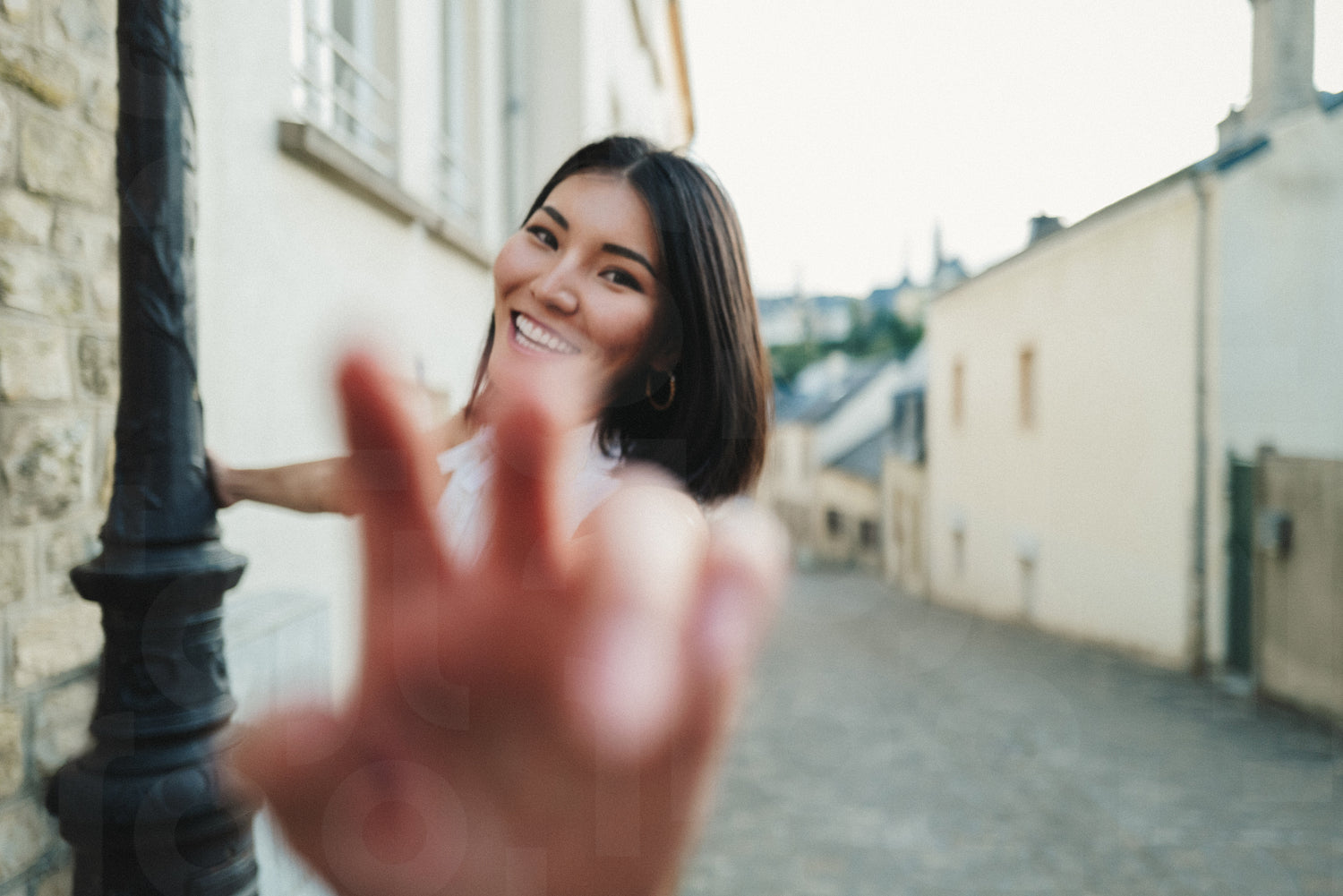 Playful woman blocking the camera with her hand. Woman having fun while on holiday in a city. This photo has intentional use of 35mm film grain.
