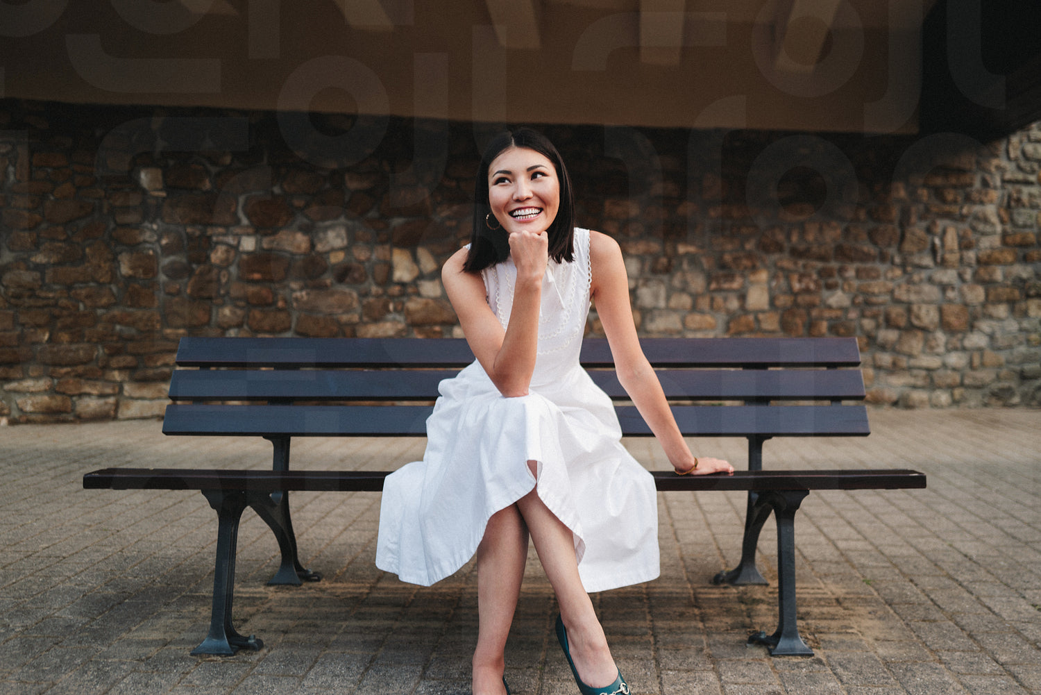 Female student looking thoughtful while sitting on a bench on campus. Happy young woman relaxing outdoors. This photo has intentional use of 35mm film grain.