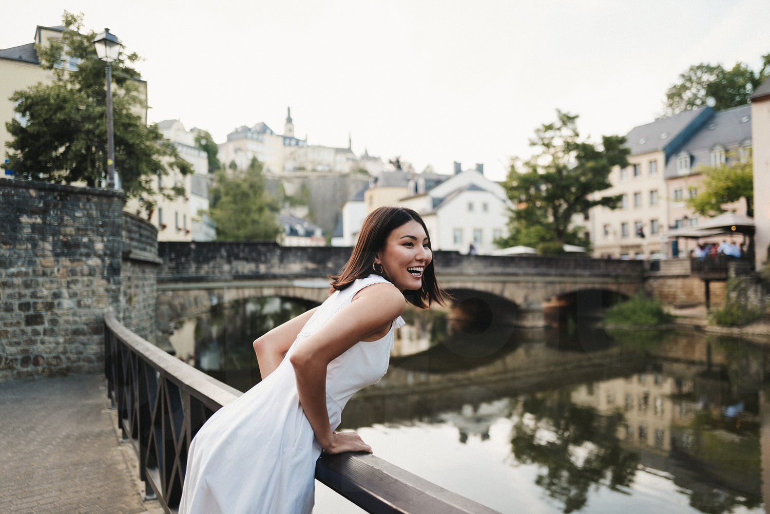 Happy woman enjoying a sightseeing tour in Luxembourg city. Young female traveller exploring European landmarks. This photo has intentional use of 35mm film grain.