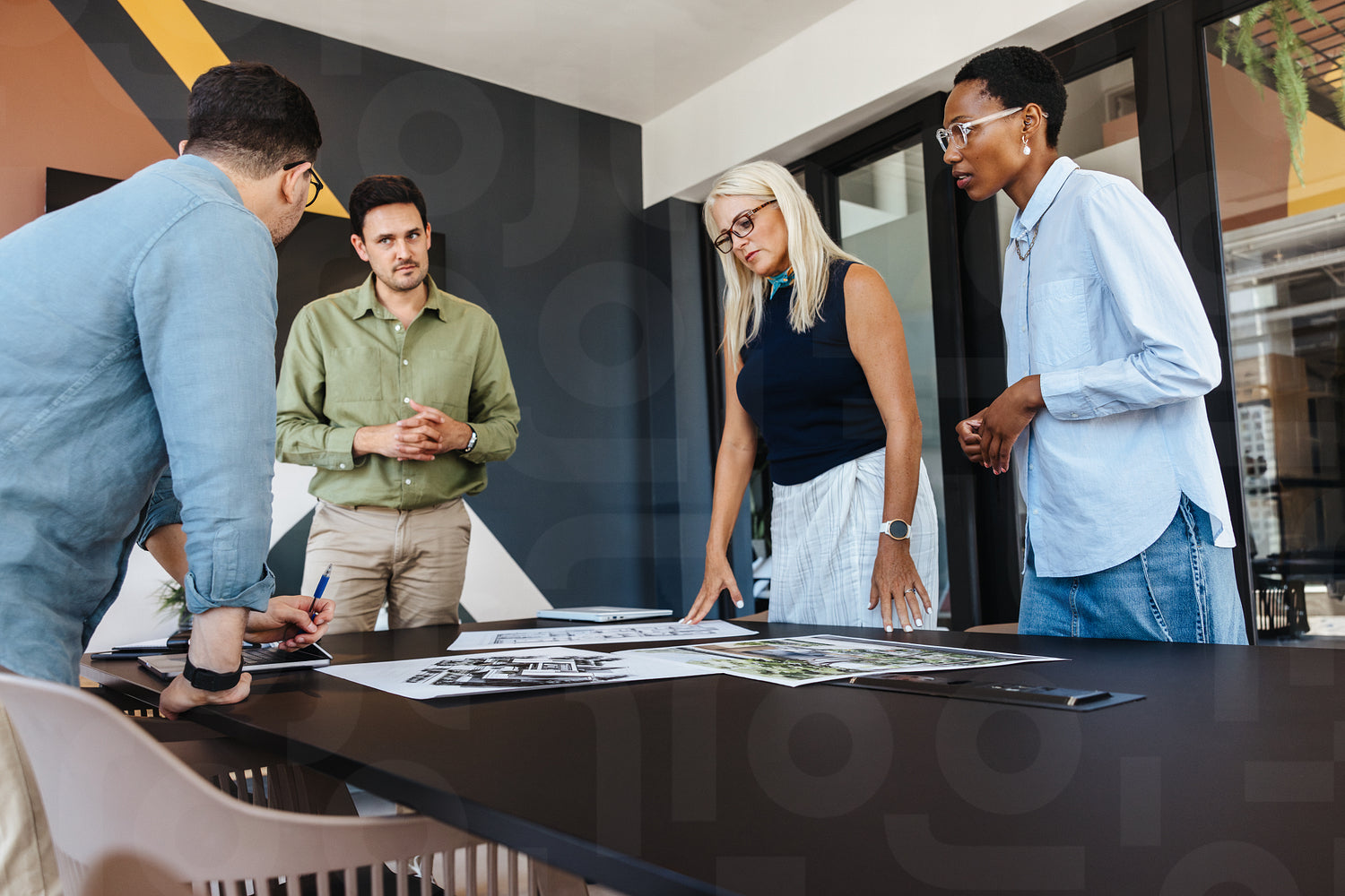 A group of diverse colleagues discussing documents during a formal meeting at the office. The workspace features a modern design, reflecting a collaborative and professional environment.