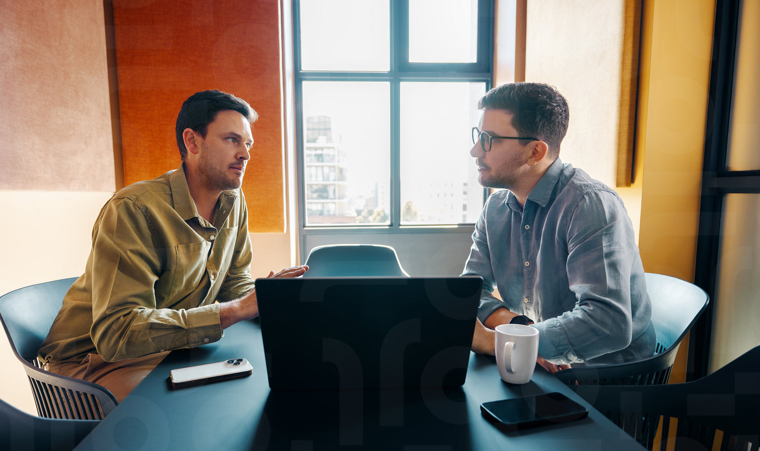 Two young adult men engage in a focused business discussion in a bright, professional office atmosphere. A laptop and smartphone on the table suggest technological collaboration.