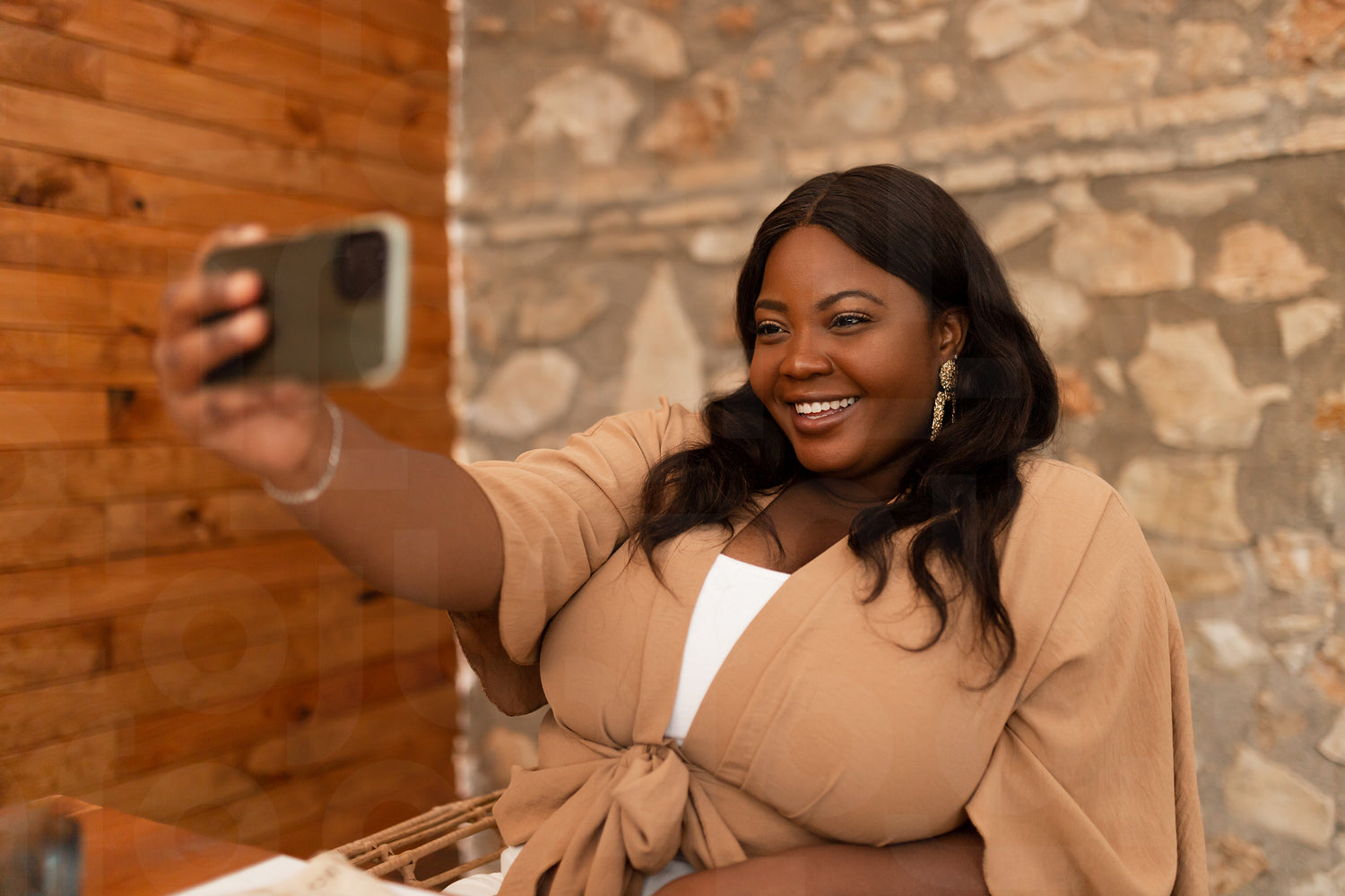 Happy young woman taking a selfie while sitting in a restaurant. Cheerful young woman having lunch alone in a cafeteria. Millennial woman capturing happy moments on the weekend.