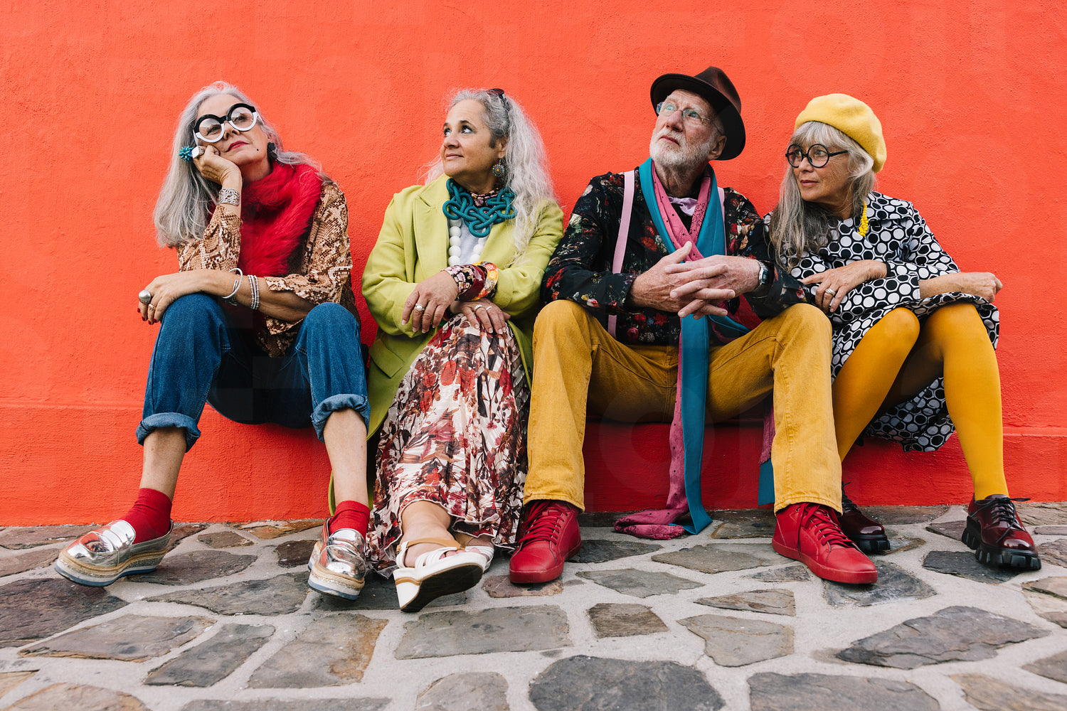 Elderly people looking away thoughtfully while sitting together against a red wall. Pensive senior citizens reflecting on past memories. Group of mature friends wearing colourful clothing.
