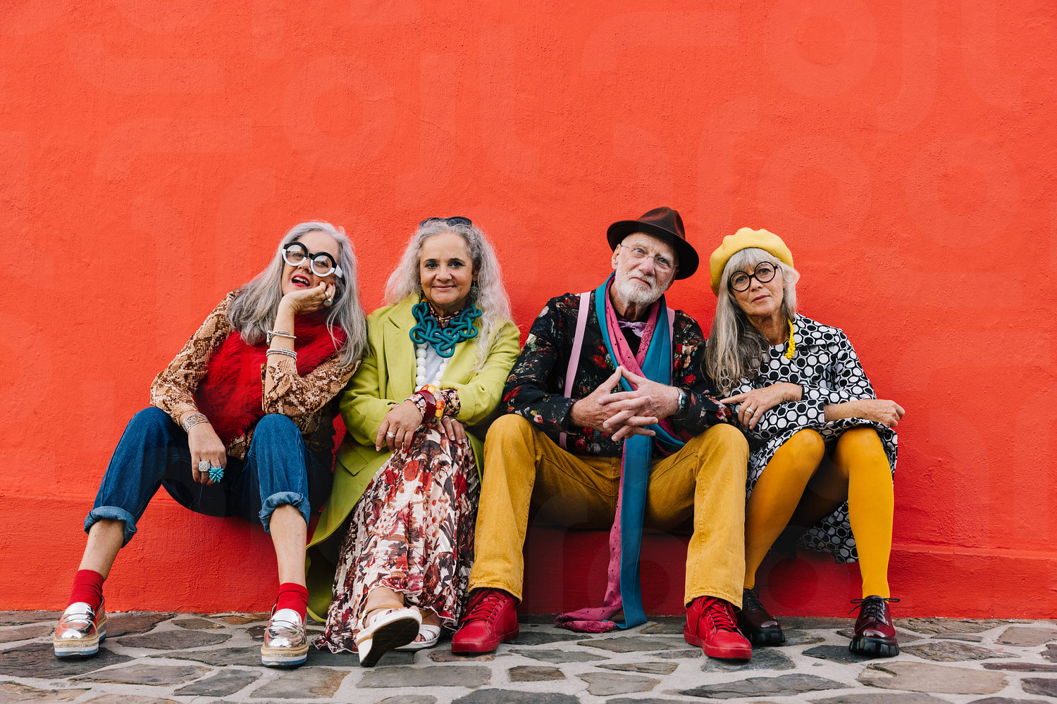 Group of carefree senior citizens looking at the camera while sitting together against a red background. Four vibrant elderly friends relaxing together in colourful clothing.