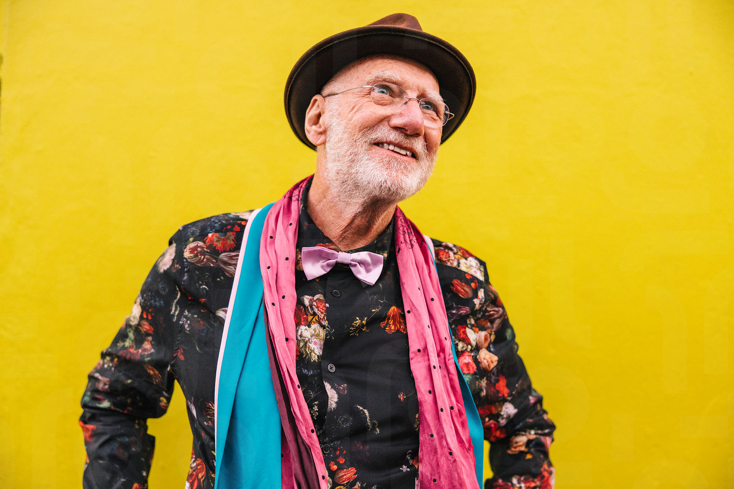 Happy senior man looking away thoughtfully while standing against a colourful background. Pensive elderly man reflecting on happy memories of the past. Mature man wearing colourful clothing.