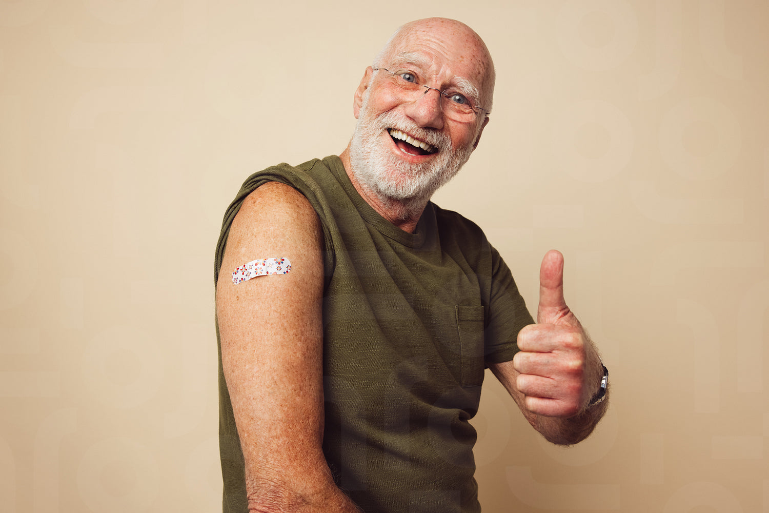 Portrait of a senior male smiling and showing thumbs up after getting a vaccine. Mature man with white beard sitting against brown background feeling positive after receiving immunity vaccination.