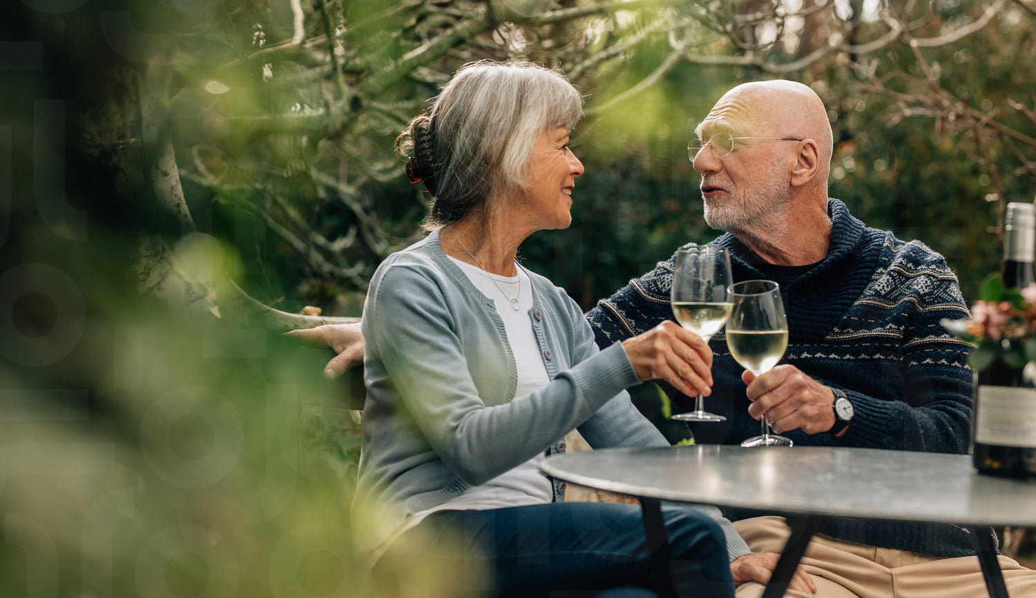 Old man and woman spending time together drinking wine. Old couple sitting together in a garden holding wine glasses looking at each other.