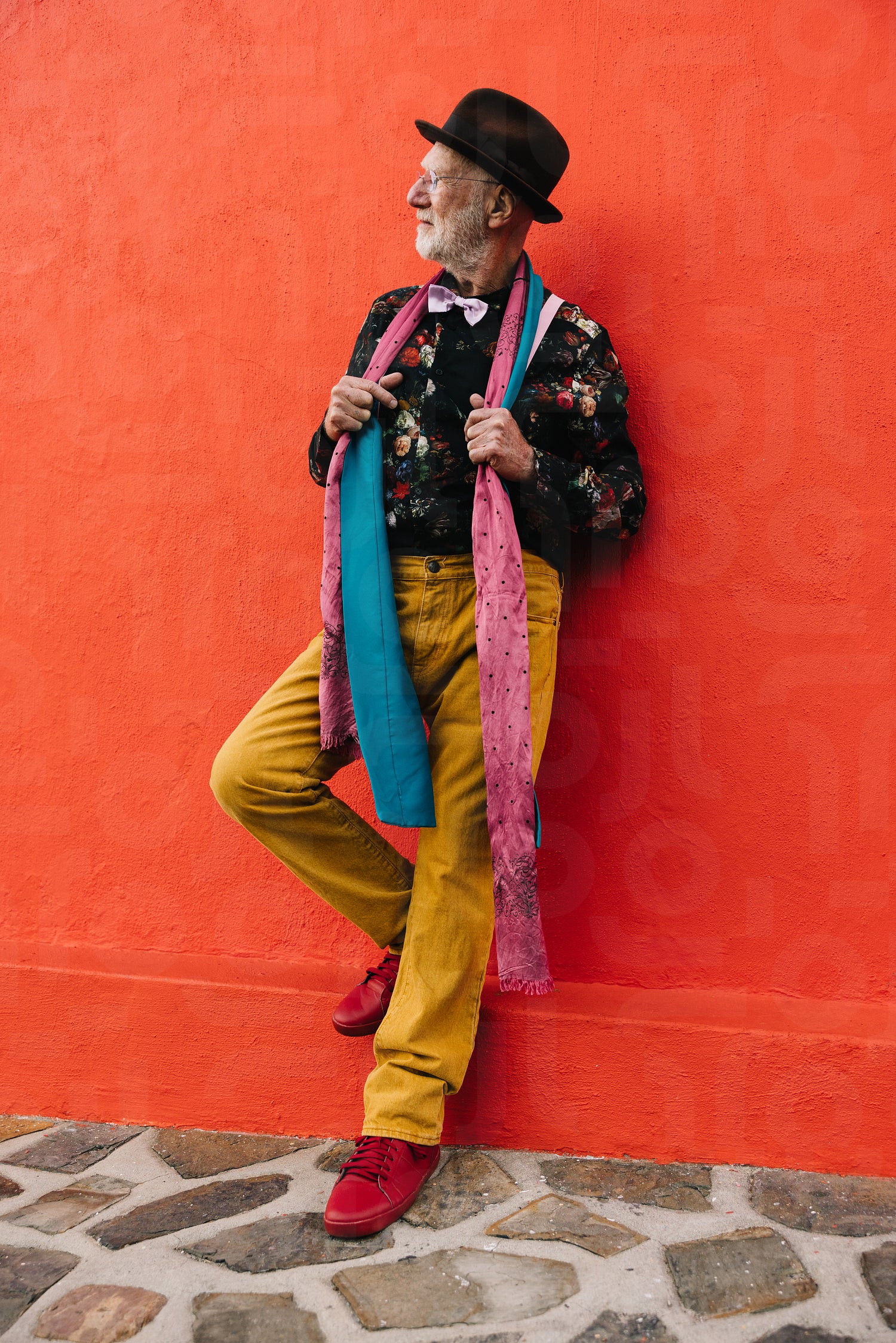Senior man looking away thoughtfully while standing against a red background. Pensive elderly man reflecting on memories of the past. Mature man wearing colourful clothing outdoors.