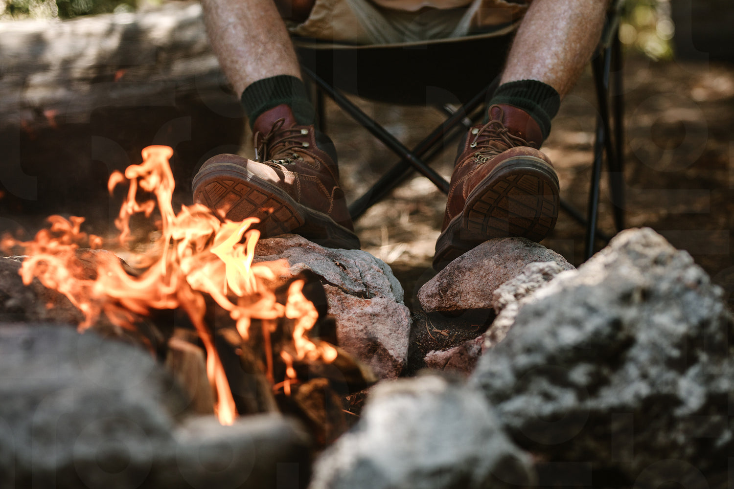 Man in boots warms his feet by the fire at camping site. Cropped shot of a senior man sitting by campfire.