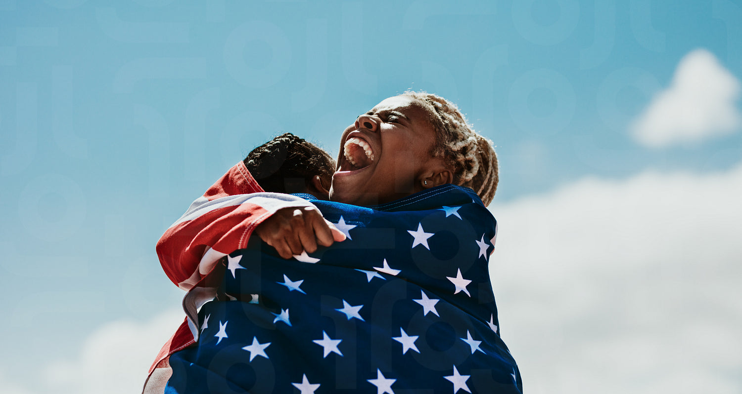 Excited american female athletes wrapped in national flag hugging each other after a winning the race. Team of USA female runners rejoicing a victory outdoors.