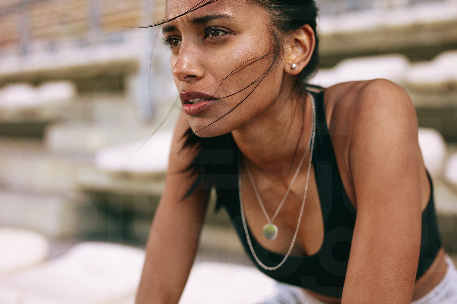 Close-up of a female athlete looking tired after training session at sports stadium. Fit woman after run on stadium race track.