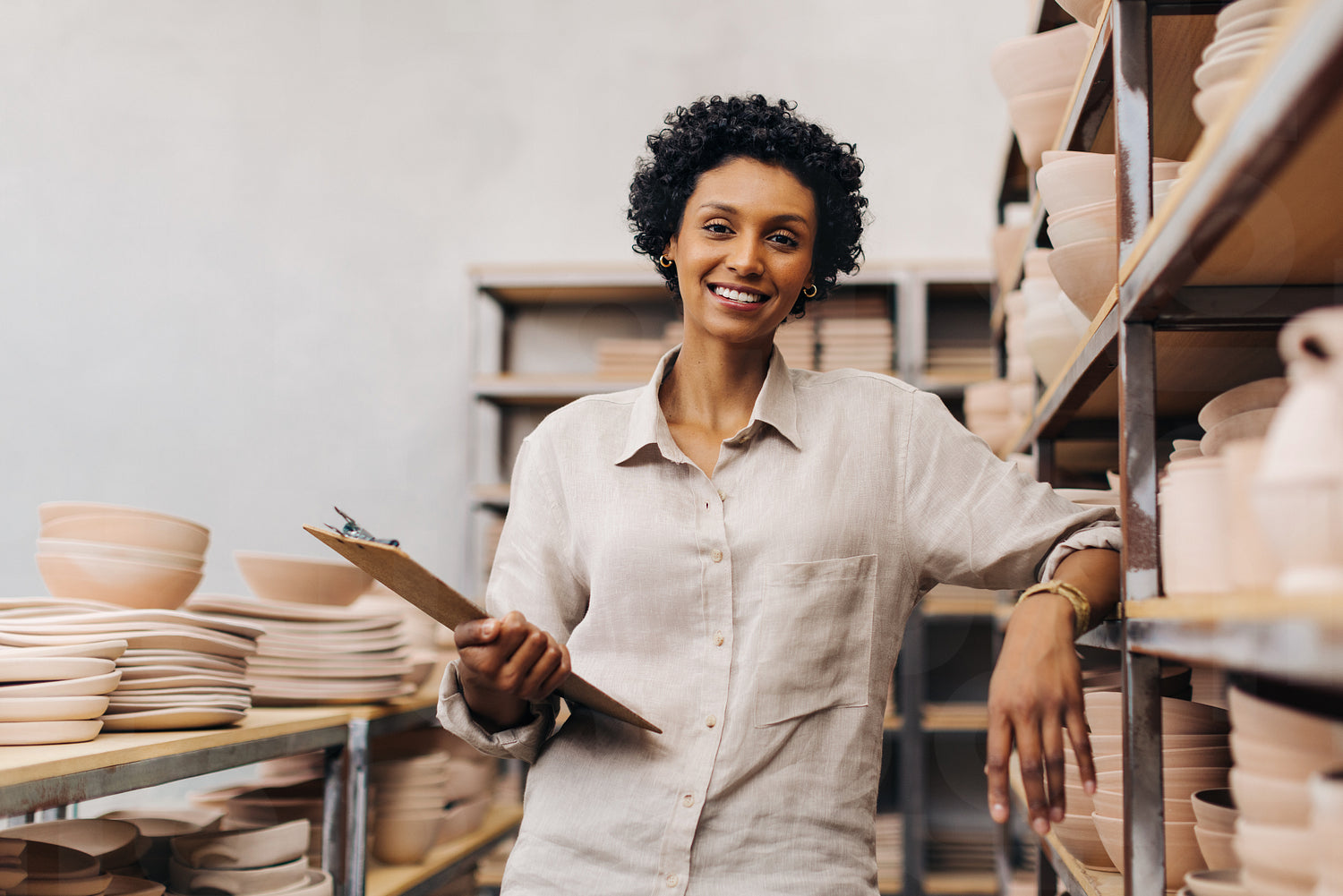 Cheerful ceramic store owner smiling at the camera while standing in her shop. Businesswoman managing a store with handmade earthenware products. Female entrepreneur running a creative small business.