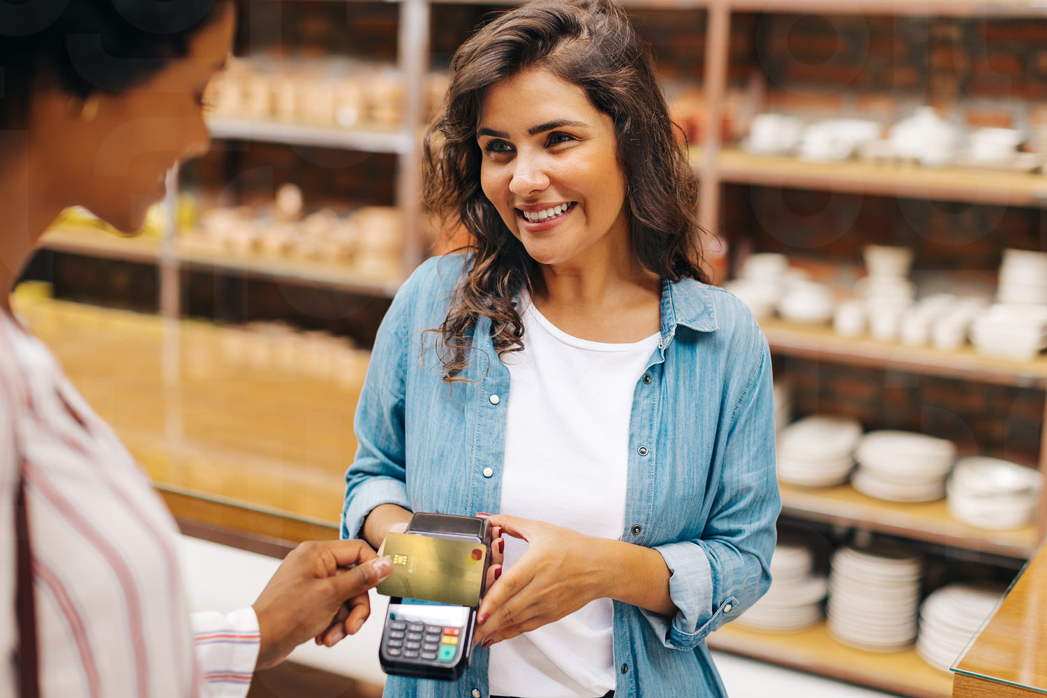 Cheerful ceramic store owner receiving a contactless credit card payment from a customer in her shop. Successful small business owner smiling happily while serving a customer.