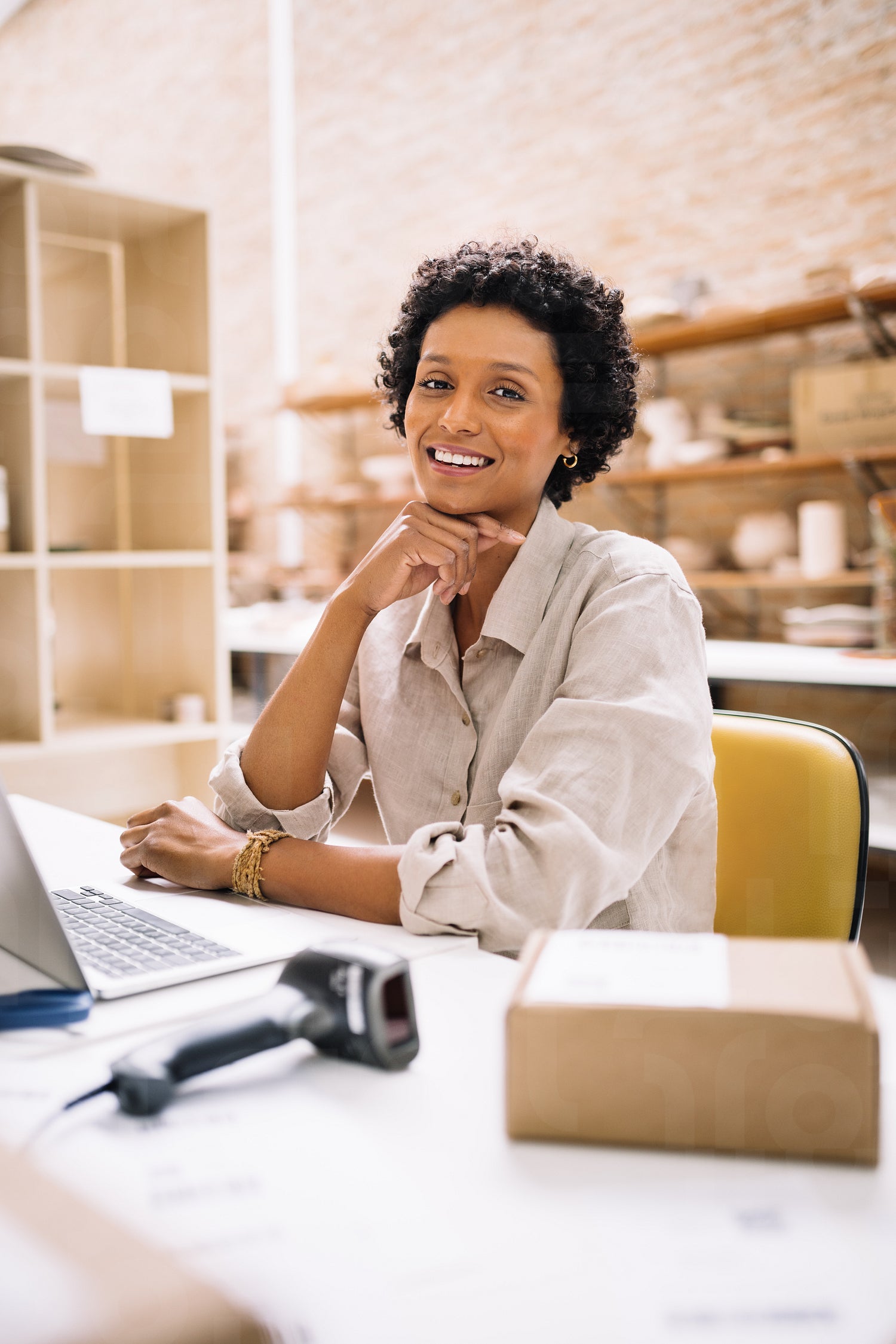 Cheerful young businesswoman smiling at the camera while working in a warehouse. Happy online store owner preparing orders for shipping. Creative businesswoman running an e-commerce small business.