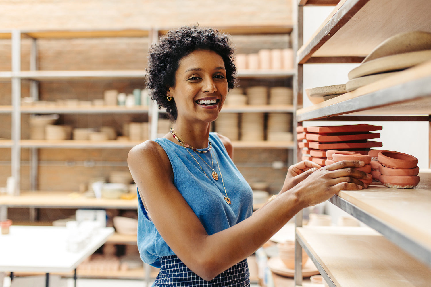 Ethnic female potter smiling at the camera while arranging her handmade ceramic products on a shelf. Happy young craftswoman running a successful small business.