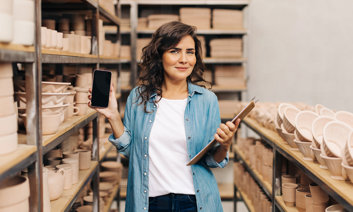 Ceramist showing a blank smartphone screen while standing in her shop. Female entrepreneur running her small business using a mobile app. Businesswoman managing a store with handmade ceramic products.