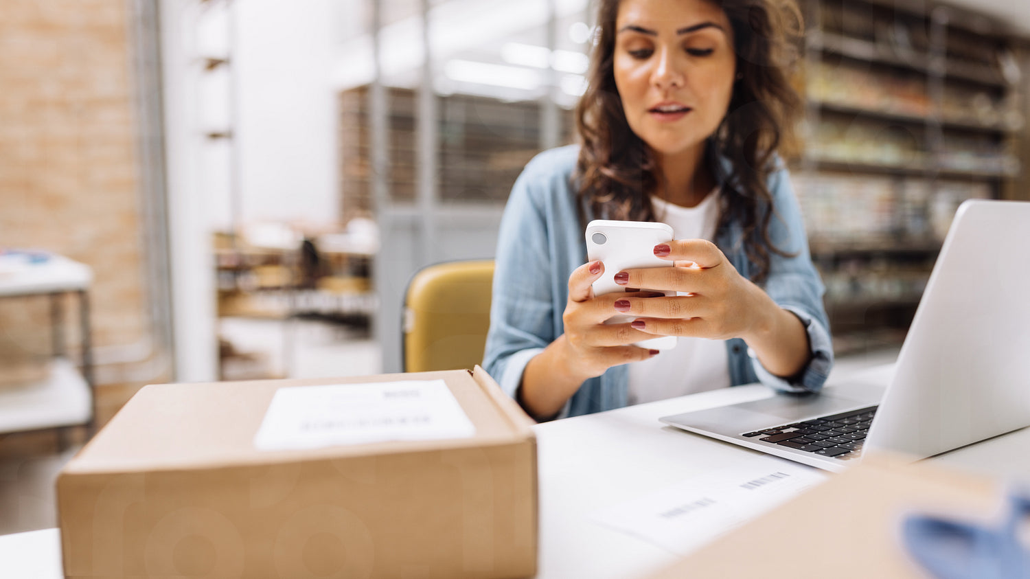 Female online store manager using a smartphone in a warehouse