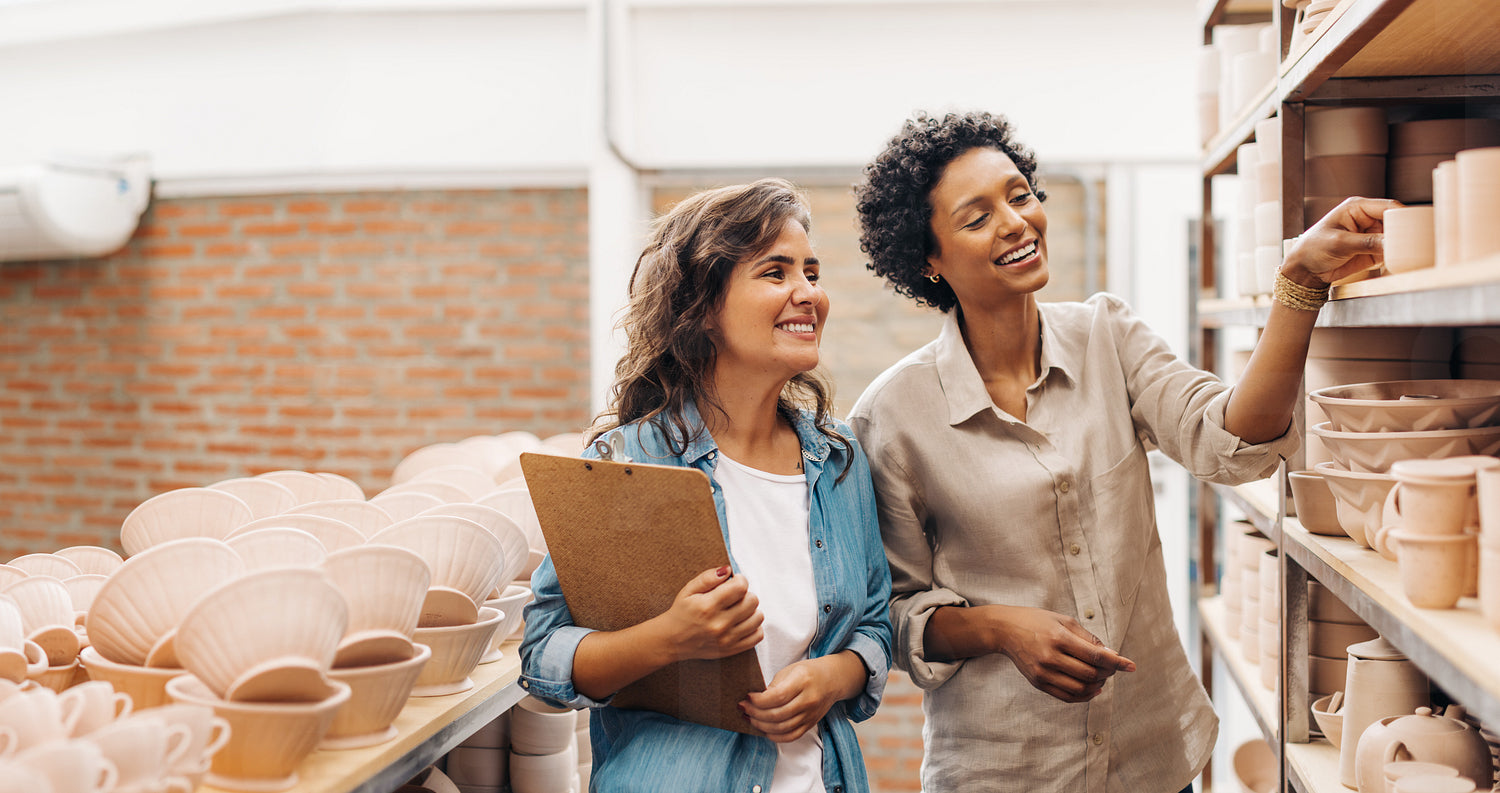 Happy ceramic shop owners having a discussion about their products. Young businesswomen managing a store with handmade ceramic products. Female entrepreneurs running a creative small business.