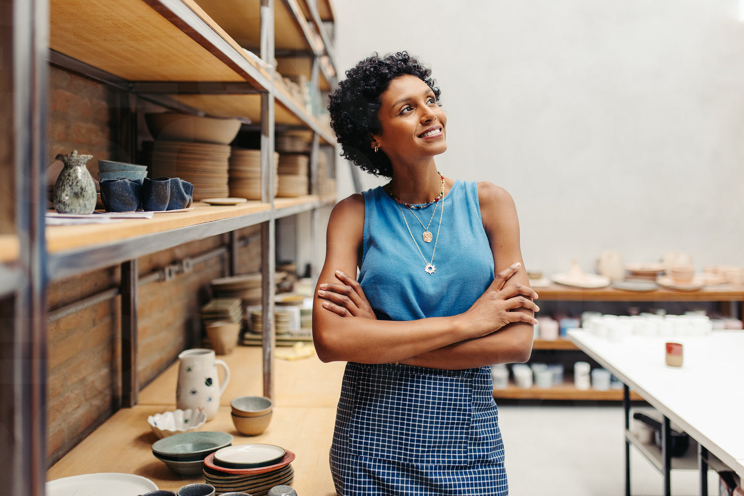 Happy young ceramist looking away thoughtfully while standing next to her handmade ceramic products in her pottery. Creative young craftswoman running a successful small business.