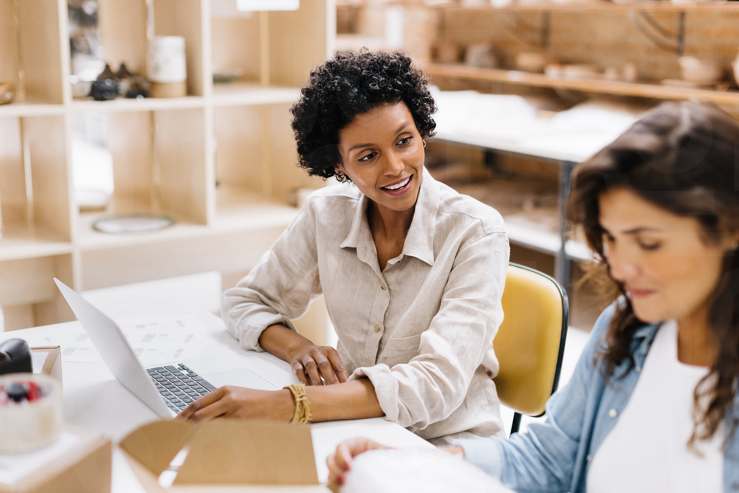 Online store owners having a discussion while preparing orders for shipping. Two young businesswomen working as a team in their warehouse. Female entrepreneurs running an e-commerce small business.