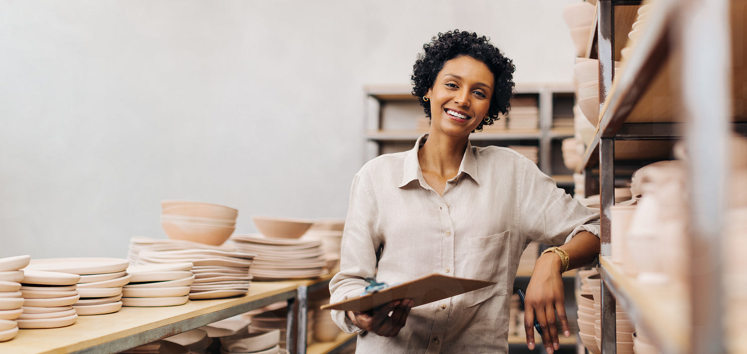 Successful ceramist smiling at the camera while taking stock in her shop. Happy businesswoman managing a store with handmade ceramic products. Female entrepreneur running a creative small business.