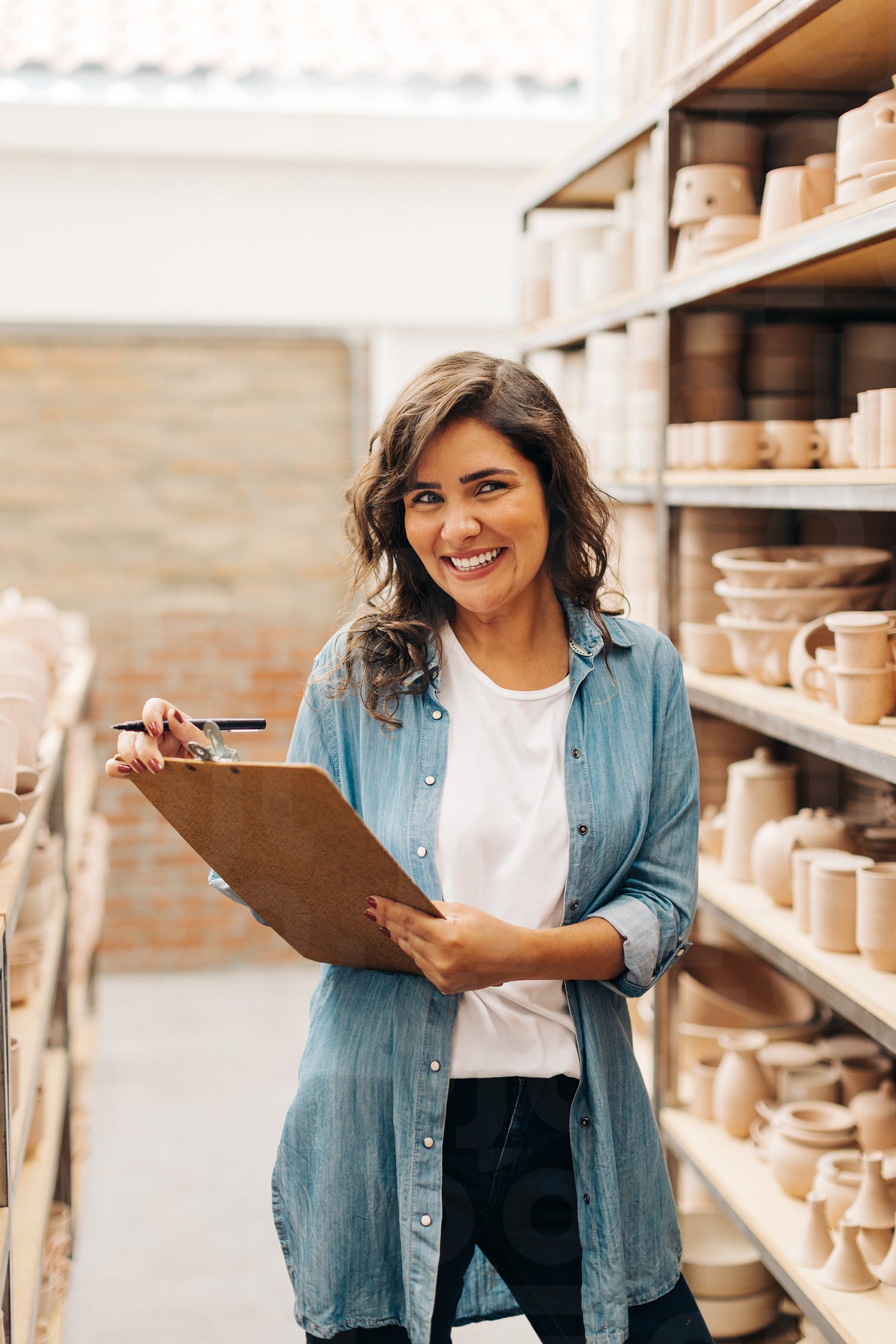 Happy young ceramist smiling at the camera while stocktaking in her shop. Creative businesswoman managing a store with handmade ceramic products. Female entrepreneur running a successful small business.