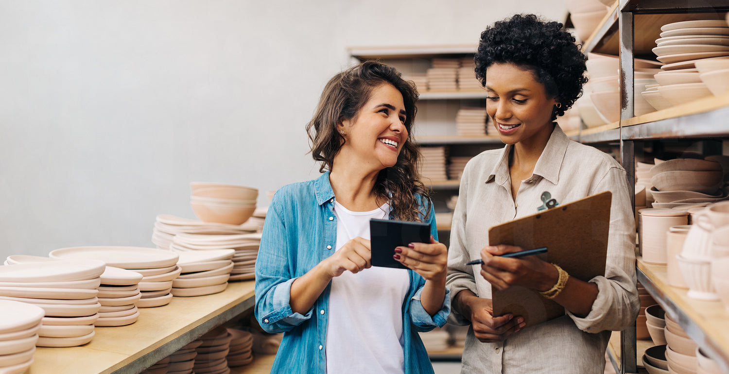 Happy female ceramists using a digital tablet together in their store. Cheerful businesswomen managing a store with handmade ceramic products. Female entrepreneurs running a creative small business.