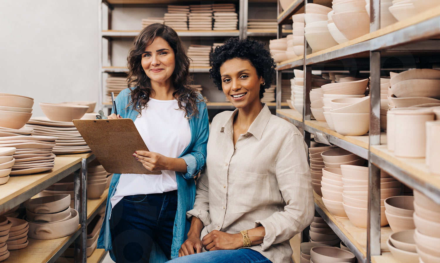 Two happy ceramists smiling at the camera while working together in their shop. Businesswomen managing a store with handmade ceramic products. Female entrepreneurs running a successful small business.
