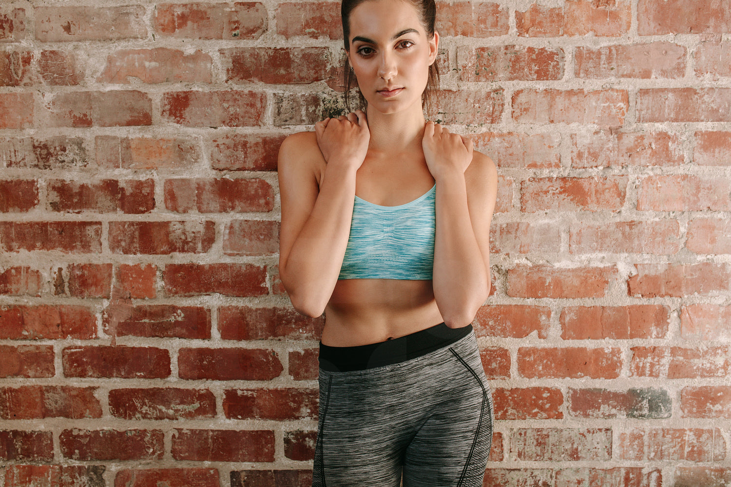 Portrait of beautiful young woman in sportswear posing against brick wall. Young woman standing in the gym.