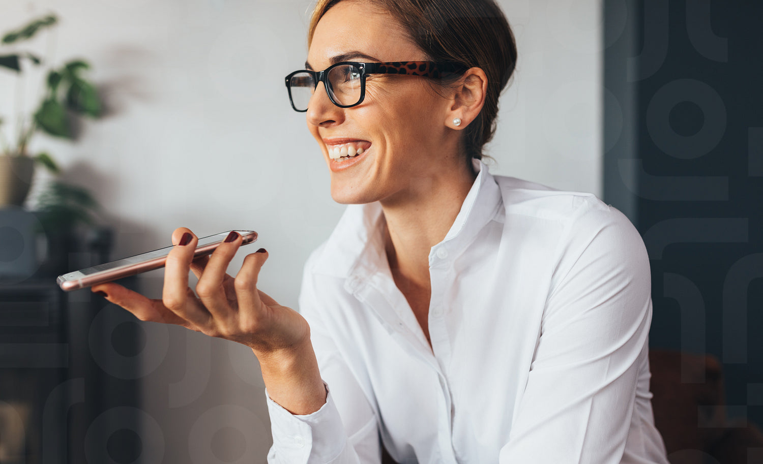 Closeup of smiling business woman talking over mobile phone on loudspeaker. Woman in formal attire holding a mobile phone close to her mouth and looking away.