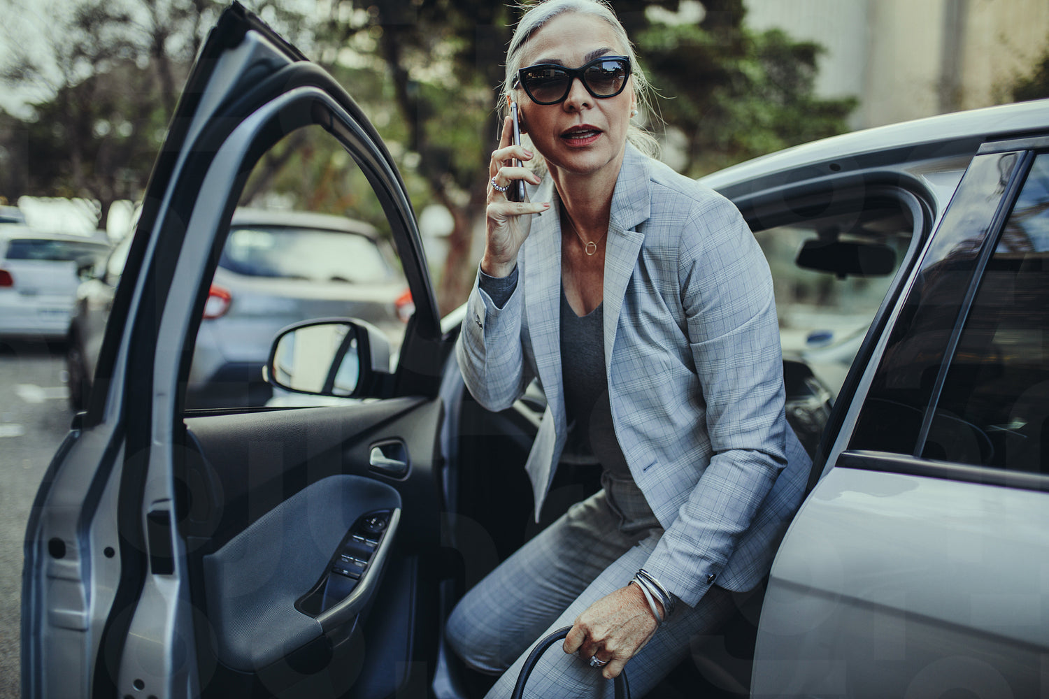 Senior businesswoman getting out of a car talking on phone. Female entrepreneur travelling to office in a luxurious car.