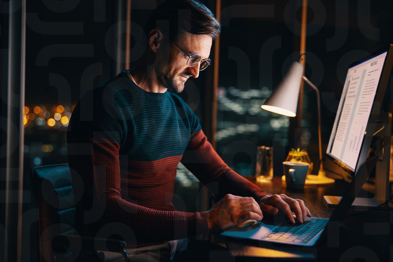 A business man working late from home, typing on a laptop. Dedicated and driven, he prioritizes his project and embraces remote work.